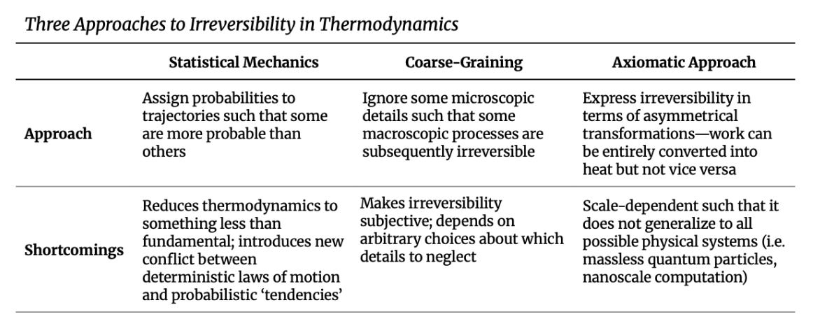 The statistical mechanical and coarse-graining approaches try to explain irreversibility in terms of trajectories (see Module 1): the former says that some trajectories are more probable than others, while the latter says that if you neglect certain (arbitrary) details, then some trajectories are ruled out. Interestingly, the axiomatic approach is not about trajectories at all, but is instead about the possibility and impossibility of transformations.